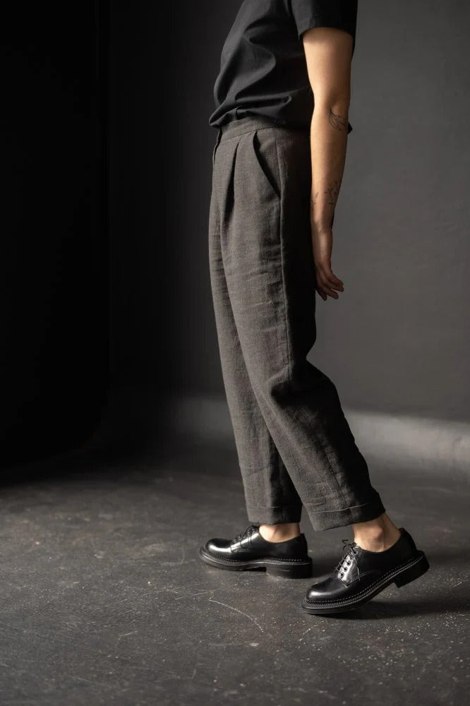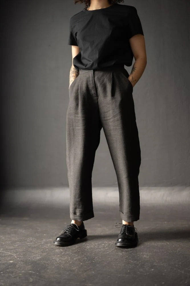 - Indigo Heavyweight Linen - We can't deny a good linen! The deep, dark hue, a complex navy, shows off the twill weave of this heavyweight linen. Soft and delicately textured, this fabric has a fuller drape that's perfect for this looser fitting pants style. And because it's on the heavier side, this linen is a wonderful transitional piece, going from winter to summer in a snap!